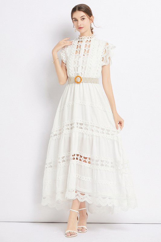 Details-Embroidered Ruffle long maxi dress, round neckline, sleeveless, elasticized trim waist with belt