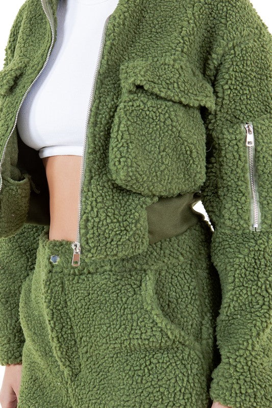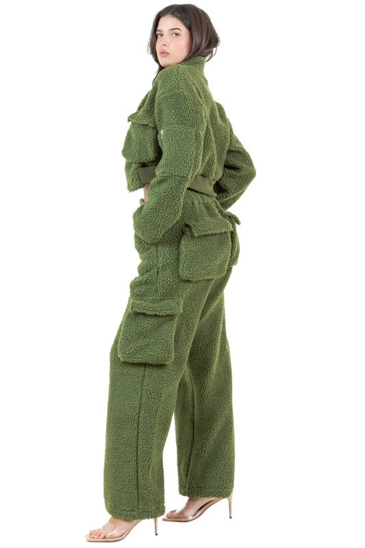 Sexy 2pcs set,front-zip closure, long sleeves,multi-pocket cargo style, belt loops zipper up pants, teddy bear style