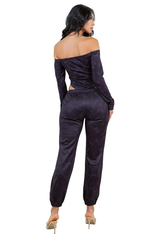 Denim 2pcs set ,Top is body suit, long sleeves, off shoulder, elasticized waist pants